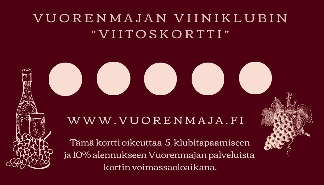 Klubikortti oikeuttaa lisäksi 10% alennukseen Vuorenmajan palveluista muulloin kuin klubitapaamisissa. Viiniklubin emäntänä ja kouluttajana toimii Vuorenmajan yrittäjä, sommelier ja viiniasiantuntija WSET3, Anu Schuoler.